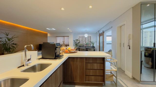 - 144m² a/u - 3 dormitórios - Sala ampliada - Escritório - Lavabo - Móveis planejados - Sacada gourmet com fechamento em vidro - Duas vagas de garagem Condomínio com laser completo, academia, churrasqueira, piscina salão de festa e quadra.