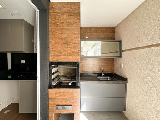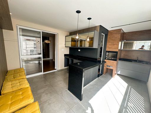 - Varanda gourmet com churrasqueira a carvão e cortina de vidro
