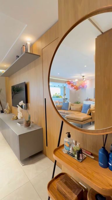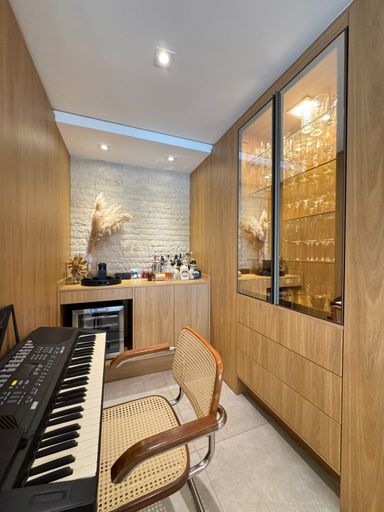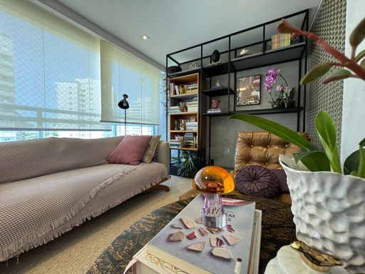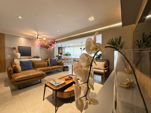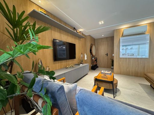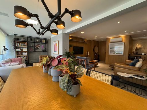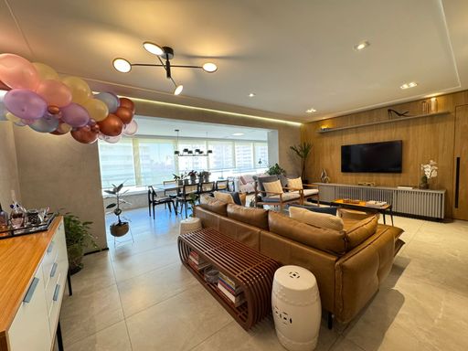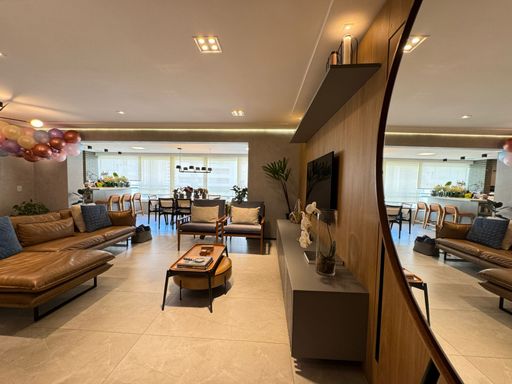 - Sala para 3 Ambientes integrada à uma Ampla varanda gourmet com cortinas de vidro e blackout, gerando um espaço de convivência de 6 ambientes